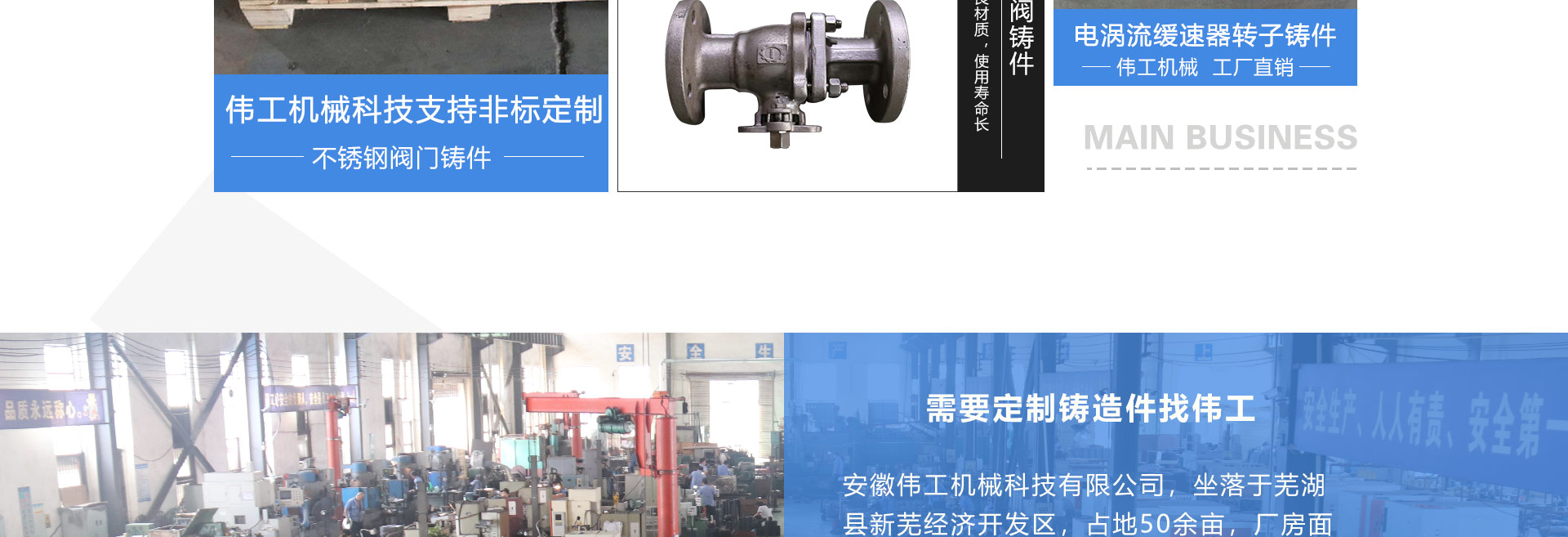 安徽偉工機械科技有限公司,坐落于安徽蕪湖新蕪經(jīng)濟開發(fā)區(qū),是一家専業(yè)從事鑄造產(chǎn)品設計、研發(fā)、生產(chǎn)、銷售于一體的企業(yè),公司為客戶的產(chǎn)品提供多樣的技術支持與設計,公司主要鑄造技術有潮模砂鑄造、硅溶膠精鑄工藝。主要產(chǎn)品有:不銹鋼閥門配件、泵閥配件、汽車配件、工業(yè)管道配件、工程機械配件、汽車配件等。材質為:低合金鋼、304、316、316L、鉻鉬鋼、哈氏合金、碳鋼、雙相鋼等。公司已先后通過ISO9001和TS16949等多種體系審核,以完備的管理手段和齊全的檢測設備滿足客戶需求,進的設備,専業(yè)的技術,嚴謹?shù)墓芾恚€(wěn)定的質量。服務客戶,鑄造未來,偉工誠摯的歡迎新老客戶共同商洽合作